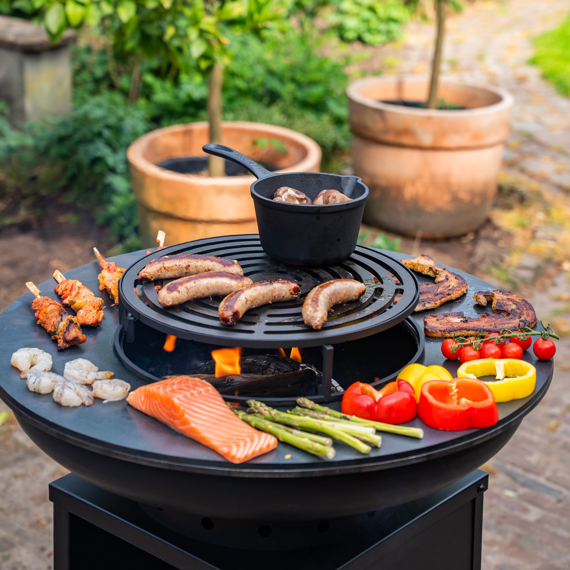 Un grill plancha est une nouvelle tendance, il vient du sud de l'Espagne et sera la nouvelle tendance de 2025. Vous pouvez utiliser le Grill Ring tout au long de l'année et c'est un bijou pour votre terrasse. Magnifique combinaison avec une base revêtue de noir et un bol en Blackline.